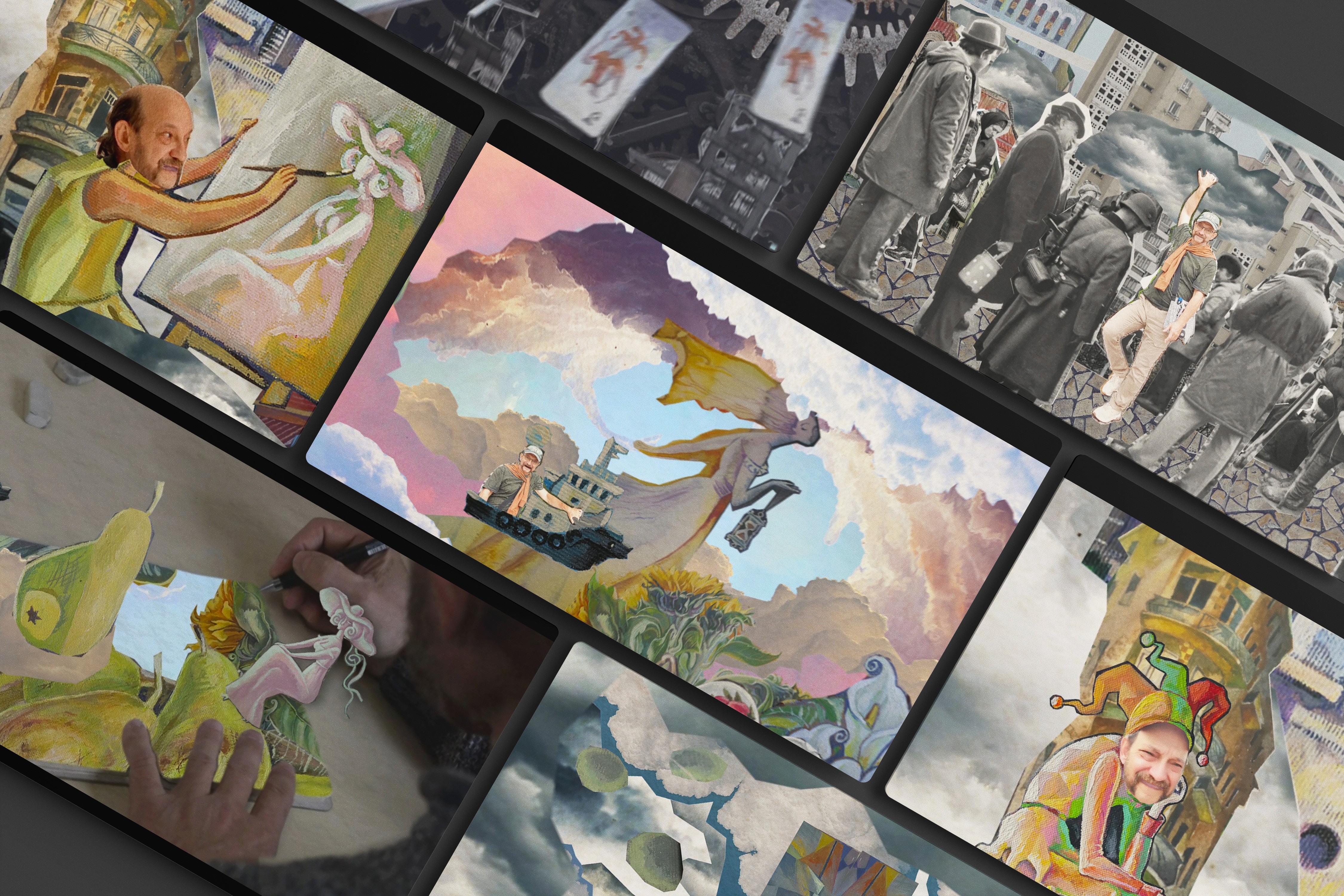 Through a broadcast design animated by collage technique, the teaser follows Yuri’s journey from the gray routine of everyday life into a magical world that gradually reveals his artworks, inner self, and creative spirit. The collage Broadcast Design includes animated segments of the artist himself, positioning him as the narrator of his own story, alongside cut-out fragments taken from his paintings, objects and characters brought to life within his artistic universe. Together, these elements immerse the viewer in a rich, imaginative artistic journey that leaves them wanting more.
